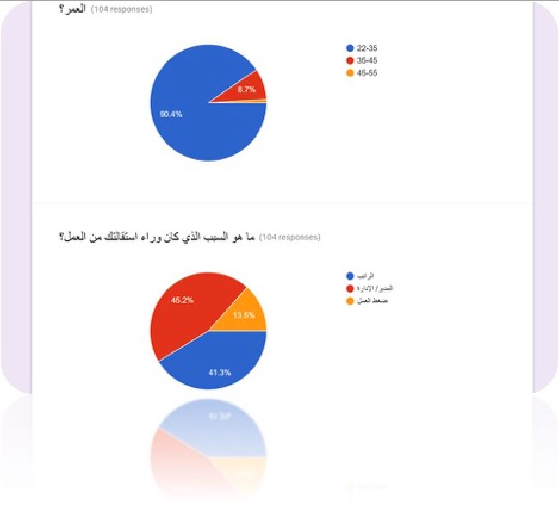 شارك في الاستبيان 104 موظفين خاضوا مرحلة الاستقالة، 90.4% تراوحت أعمارهم ما بين 22-35 سنة، بينما بلغت نسبة المشاركين الذين جاءت أعمارهم ما بين 35-45 سنة، 8.7%، أما عن الفئة العمرية التي انحصرت ما بين 45-55 سنة لم تتجاوز الـ1%.