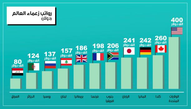 وهنا لا بد من الإشارة إلى أن بعض البيانات والتصريحات الإعلامية، كانت قد أشارت إلى أن راتب رئيس الوزراء العراقي السابق نوري المالكي بلغ 250 ألف دولار شهرياً، ما يعني 3 ملايين دولار سنوياً، وهو أعلى من راتب رئيس الولايات المتحدة الأميركية بأضعاف.