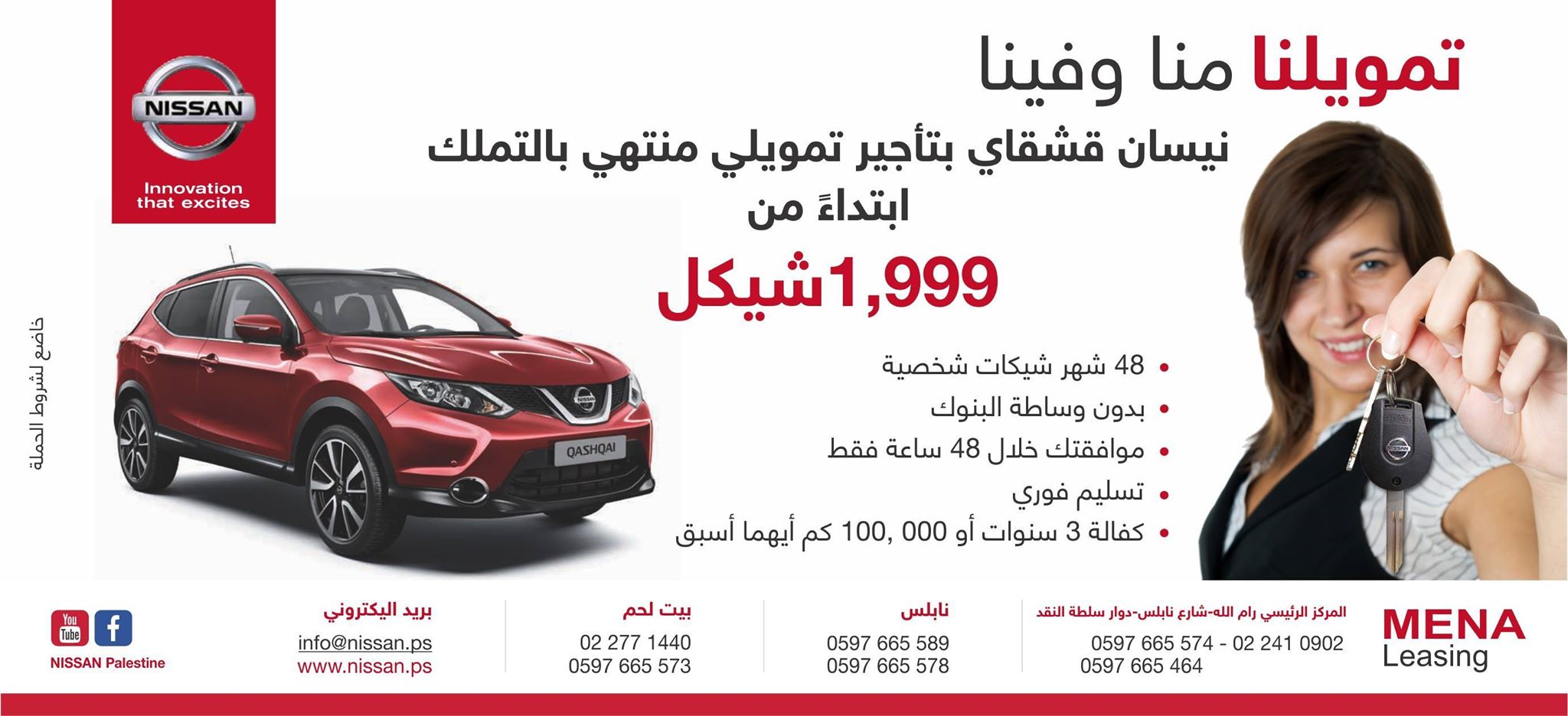 وجاء في عرض الشركة ان تملك سيارة نيسان قشقاي سيأتي بتأجير تمويلي منتهي بالتملك ابتداءً من 1999 شيقل فقط لاغير.