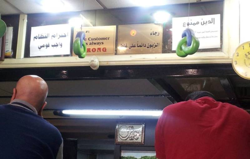 الحاج ابو معاذ صاحب محل معاذ للاتصالات، يضع عدة لافتات داخل محله الصغير، منها لافتة تقول (الزبون دائما على غلط، وبالانجليزية " “rule #1 ..the customer is always wrong".