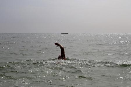 ويواجه السباح خطر أسماك القرش ولسعات قناديل البحر بالاضافة الى الأمواج المتلاطمة وفراشة بحر تحاول أن تعشش في أذنه اليسرى.