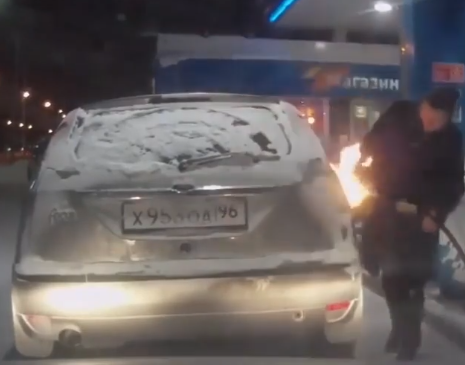 وقفت المرأة تزود سيارتها بالوقود بإحدى محطات البنزين ثم لسبب غير معروف قررت إشعال ولاعتها وتقريبها من فوهة البنزين لتشتعل النيران على الفور وتنتشر على السيارة.