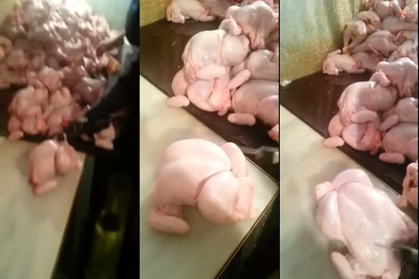 وكالات - الاقتصادي -تداولت مواقع التواصل الاجتماعي تسجيلاً مصوراً مثيراً للاشمئزاز، يظهر لحظة قيام عاملة في أحد متاجر بيع الدجاج بنفخ الدجاج بعد ذبحه ونتف ريشه ليبدو أكبر حجماً، بهدف الحصول على سعر أكبر، بحسب صحيفة ميرور البريطانية.