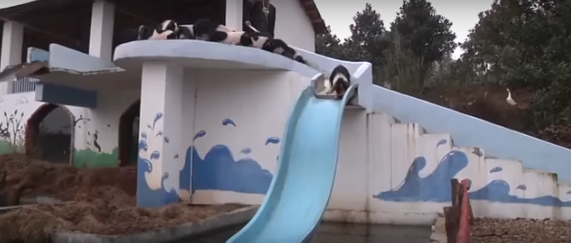 وفي الفيديو الذي تم تصويره في مدينة نينيانغ هوتان، تظهر مجموعة من الخنازير البرية، وهي تتزلج تارة وتقفز إلى الماء تارة أخرى. ويقول صاحب المزرعة إنه يعامل الحيوانات مثل أبنائه.