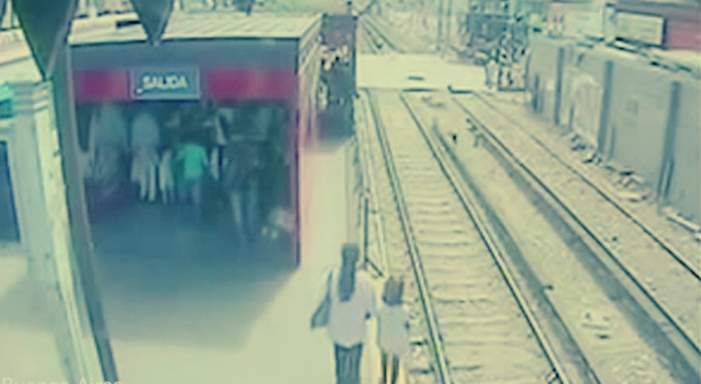 وظهرت الأم مع طفلتها ينزلان من فوق الرصيف في محطة مزدحمة بمدينة بوينس آيرس، إلا أن الأم فوجئت بقدوم القطار وعادت مسرعة إلى الرصيف لكن ابنتها لم يكن لديها الوقت للصعود.