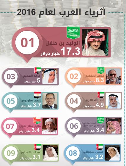 وتراجعت ثروات 32 مليارديراً عربيّاً بمقدار 29.9 مليار دولار عن العام الماضي 2015، لتصل إلى 95.5 مليارات دولار في 2016، وتراجعت ثروة الوليد بن طلال بأكثر من 20%، لتصل إلى 17.3 مليار دولار، لكنه يظل في صدارة القائمة.
