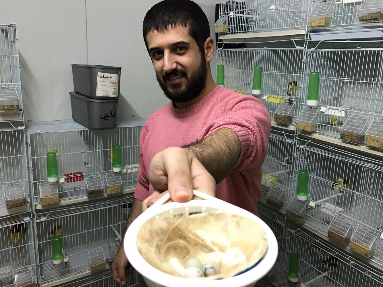 ويضيف وهو يحضر الماء والطعام للعصافير الموجودة داخل غرفة صغيرة في حديقة منزله: "لازم كل يوم اصحى الصبح قبل الساعة 7 احضرلهم الماء والاكل وارجع عالساعة 7 المسا عشان اشوف شو ناقصهم وبضل اعتني فيهم على مدار 7 اشهر بالسنة".