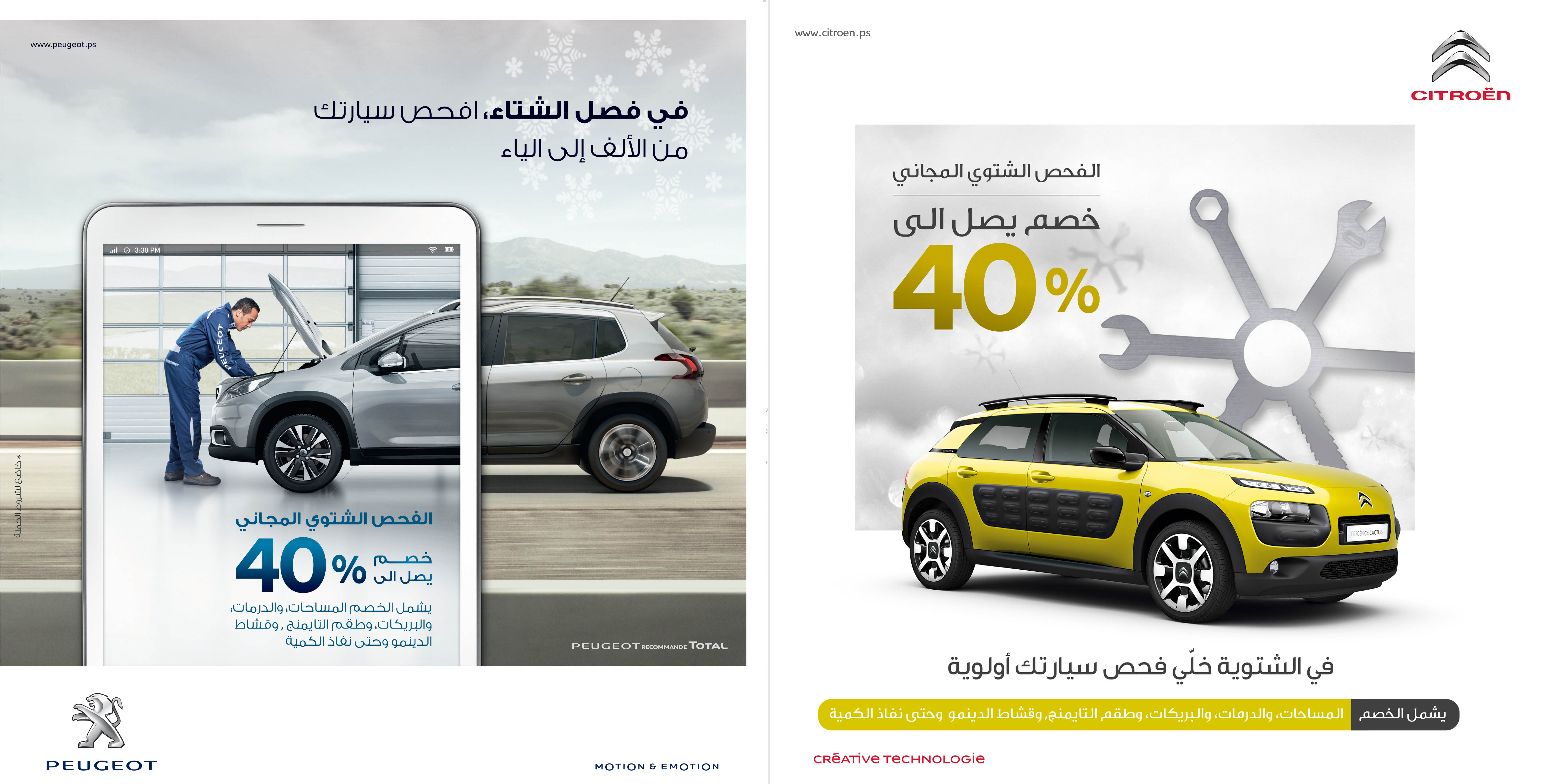 تأتي هذه الحملة ضمن شعار مركز خدمات ما بعد البيع لبيجو وسيتروين في فلسطين "معاً نأخذ سيارتك لأبعد مدى"، حيث يوفر المركز العديد من المزايا لزبائن مركبات العلامتين التجاريتين. ويقدم المركز حملة الفحص الشتوي المجاني الجديدة لمركبات بيجو وسيتروين من مختلف الموديلات وذلك لتجهيز المركبات لتحديات فصل الشتاء، كما ويمكن لأصحاب المركبات الاستفادة من العرض الخاص على الفرامل والدرمات والمساحات وطقم التايمنغ وقشاط الدينمو حيث ستصل نسبة الخصم إلى 40% على بعض القطع والتي ستستمر حتى نفاذ الكمية .