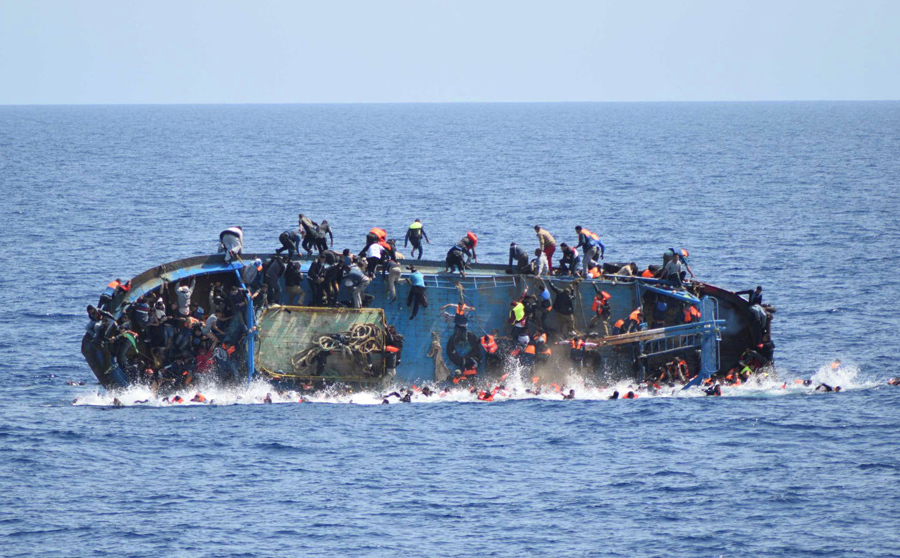 14- فرار بعض المهاجرين غير الشرعيين من قارب يغرق فيما يحاول البعض الآخر الصعود لأعلى نقطة في القارب بالقرب من السواحل الليبية قبل إنقاذهم من القوات الإيطالية.