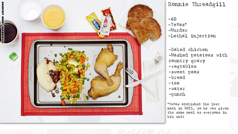 وكالات - الاقتصادي - قام المصور النيوزلندي، هنري هارغريفز بالتقاط صور الوجبات الأخيرة قبل صدور الحكم بالإعدام على الأشخاص الذين أدينوا بجرائم قتل.