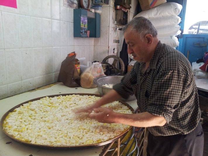 داخل محل حلويات الأقصى الشهير في البلدة القديمة بنابلس، يعمل عدد من الشبان ورجل تجاوز الخمسين من العمر على تفتيت الجبنة إلى قطع صغيرة فوق العجينة التي فردت على سدر من النيكل وضع فوق طاولة.