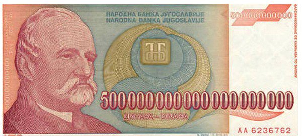 صكتها يوغوسلافيا عام 1994 لتصبح كأكبر فئة ورقية في البلاد، وهي عبارة عن رقم كبير جدا يصعب عدّه.