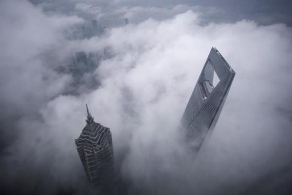 المركز المالي العالمي بمدينة "شنغهاي" الصينية، وبرج "ماو" أثناء تساقط كثيف للأمطار في الخامس عشر من مايو/أيار الجاري.