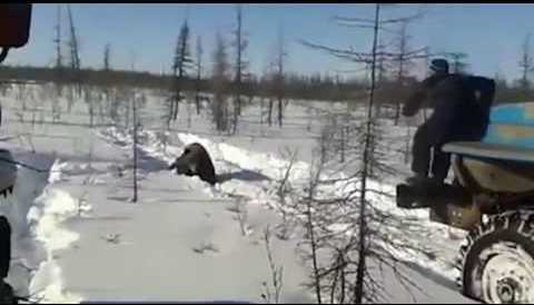وفي بداية الفيديو يحاول الدب الذي بدا منهكاً أن يهرب بالجري فوق الثلوج التي غطت الأرض، لكن الشاحنة كانت أسرع منه بكثير، وسرعان ما صعدت عجلاتها فوقه لتزيد من معاناته.