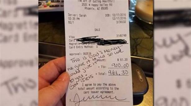 وكالات - الاقتصادي - تركت سيدة 900 دولار كـ"بقشيش" لنادلة في مطعم بمدينة فونيكس في ولاية أريزونا الأميركية بجانب ورقة في الحساب مكتوب فيها إنه "مال منحه الرب اياها" لإعطائه لها، وفقاً لما ذكرته وسائل اعلام.