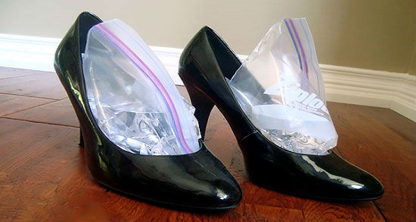 في البداية، أنت بحاجة إلى اثنين من الأكياس البلاستيكية القابلة للإغلاق وإعادة الاستخدام، وملئ ربعها بالماء، ووضعها في أحذيتك، ثم قم بتخزينها في الثلاجة.