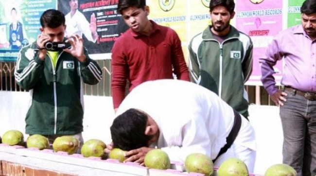 باكستاني يكسر برأسه 43 حبة من جوز الهند