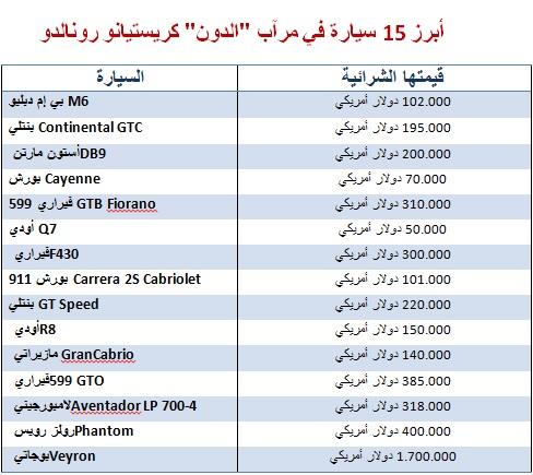 رونالدو يمتلك عشرات السيارات، فهو إلى جانب عشقه لكرة القدم عاشق كذلك للسيارات الفارهة التي يمتلئ مرآب منزله بها، إلا أن هناك 15 سيارة امتلكها رونالدو خلال السنوات الـ10 الأخيرة هي الأبرز بين سياراته.