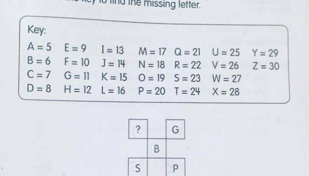 ويعرض التمرين جدولين، يضم الأول تشكيلة من الحروف المرصوصة ضمن منطق خفي في مربعات، بينما يعرض الجدول الثاني الحروف الأبجدية مقرونة بقيمة عددية معينة، كما يظهر في الصورة. والمطلوب هو العثور على الحرف الناقص في المربع.