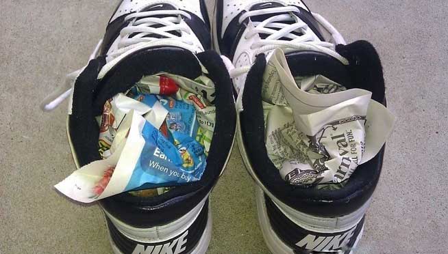يمكنكم تجفيف حذاءكم بسرعة باستخدام أوراق الصحف الملفوفة على شكل كرة: