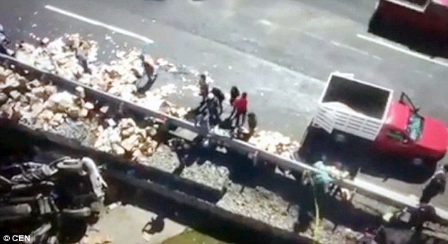 ويبيّن مقطع الفيديو الناس وهم يهربون بعدما انقلبت الشاحنة.
