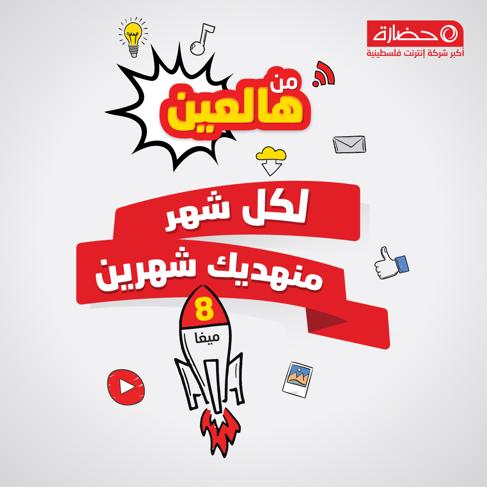و قال مدير عام شركة حضارةالسيد رامي قطينة أن حملة"من هالعين...لكل شهر منهديك شهرين" تستهدف مشتركي حضارة الجدد على حملة بالتل(البيوت أسرار) . وذلك حرصاً منها على تقديم العروض والخدمات المميزة لهم ،فالعرض الحالي خاص بسرعة 8 ميجا بحيث يدفع المشترك شهرين ويحصل على اشتراك لمدة 6 شهور ،اضافة الى خصم 50% على خدمات شركة حضارة المضافة . مشيرا أنه يأتي ذلك بهدف رفع مستوى الخدمات المقدمة من قبل "حضارة" لكافة المشتركين، مشددا على ان حضارة ستعمل باستمرار على تقديم العروض المميزة على سرعات خدمة الانترنت بأسعار منافسة تناسب المواطن الفلسطيني وبنفس الوقت لمنحه امكانية الاشتراك بالخدمة بأعلى سرعات و أقلتكلفة .