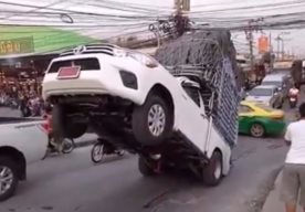 وكالات - الاقتصادي - تعرضت سيارة ربع نقل لحادث غريب بسبب حمولتها الزائدة، أثناء الصعود على أحد الكبارى بتايلاند.