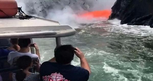 بالفيديو: أطنان من الحمم البركانية تفاجئ السياح في عرض البحر