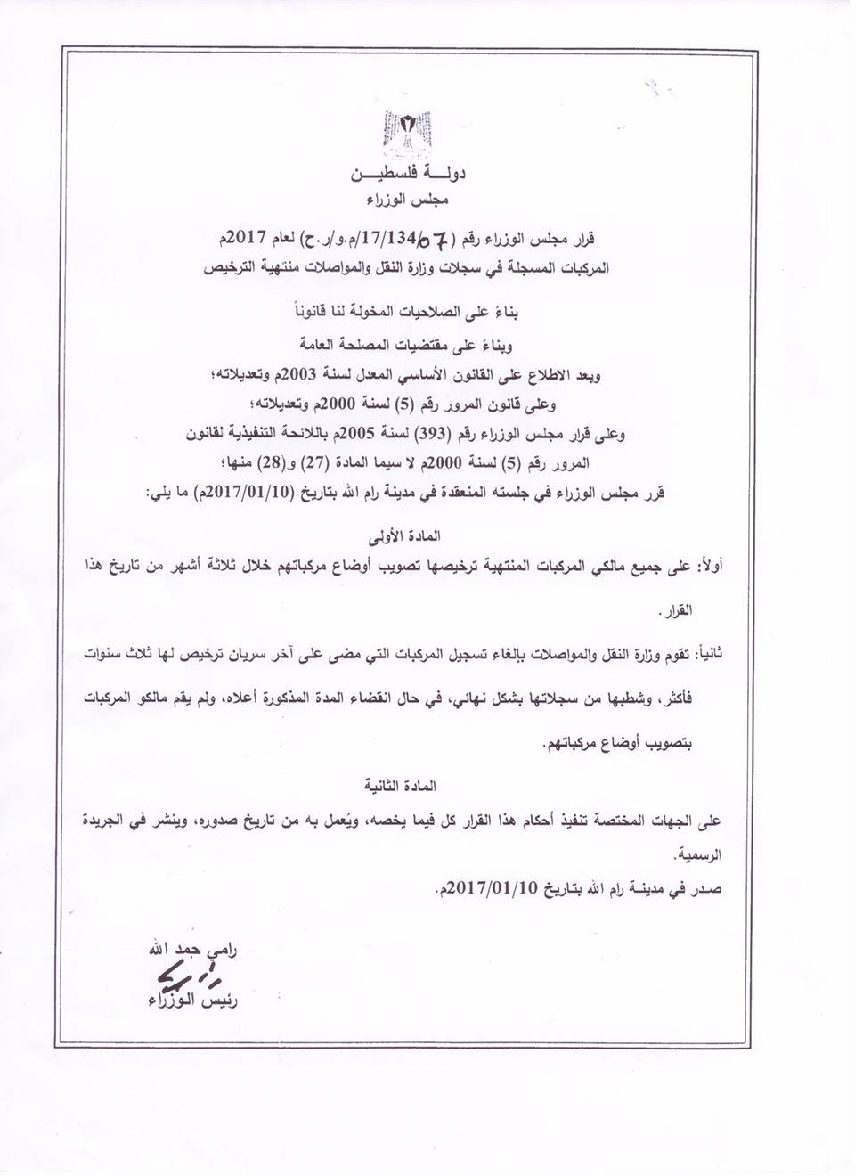القرار يطالب أصحاب المركبات المنتهي ترخيصها بتصويب أوضاع سياراتهم خلال فترة 3 أشهر، ونص على أن وزارة النقل والمواصلات ستقوم بإلغاء تسجيل المركبات التي مضى على آخر ترخيص لها ثلاث سنوات فأكثر وشطبها من سجلاتها نهائيا في حال انقضاء الشهور الثلاثة دون تصويب.