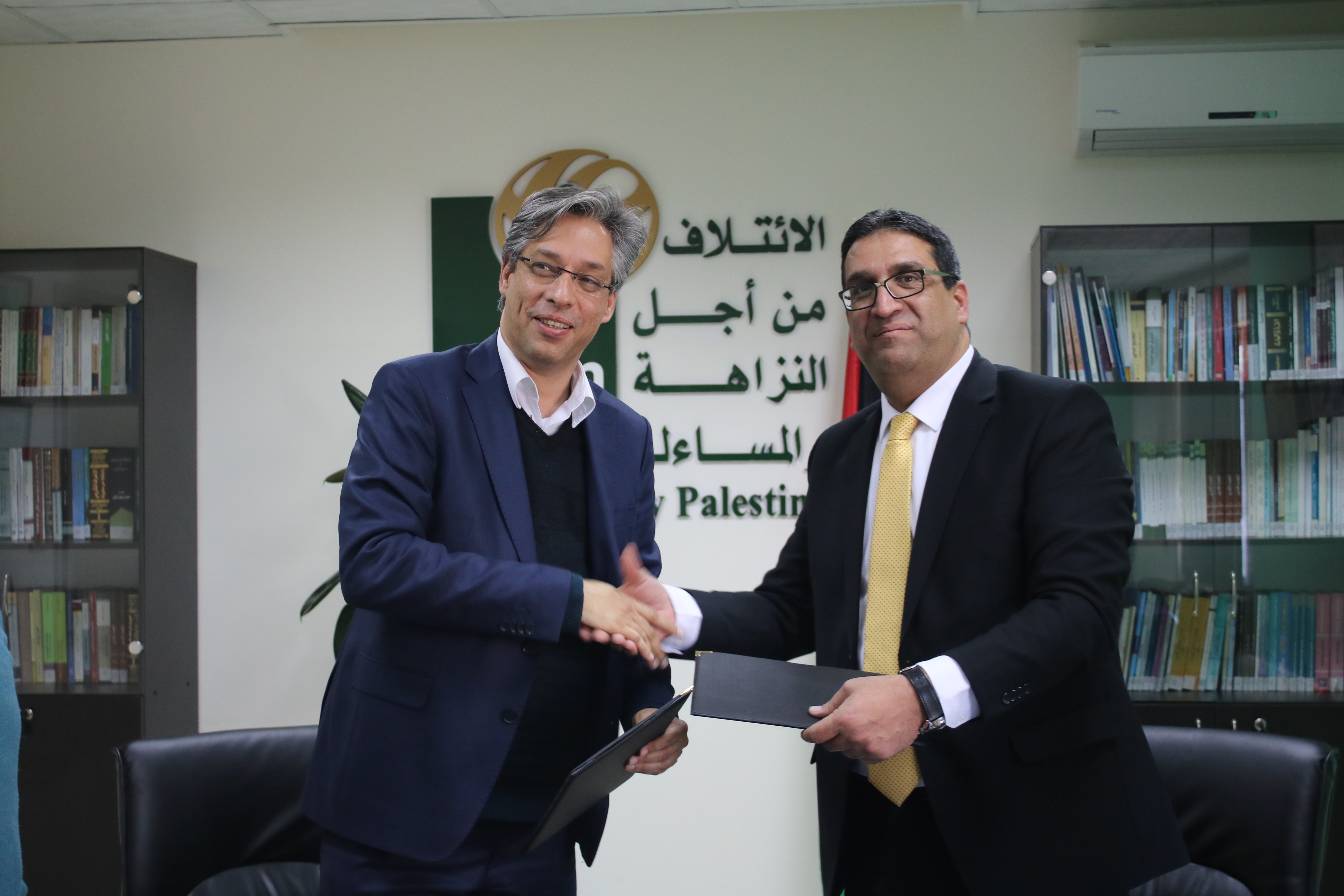 رام الله - الاقتصادي - وقع الائتلاف من اجل النزاهة والمساءلة- أمان يوم الاثنين الموافق 23/1/2016، مذكرة تفاهم وتعاون مع كلية الحقوق والإدارة العامة في جامعة بيرزيت تهدف لتعزيز علاقة الشراكة بين الطرفين لترسيخ ثقافة النزاهة والشفافية لدى طلبة الكلية والارتقاء بدور التعليم في هذا الجانب.