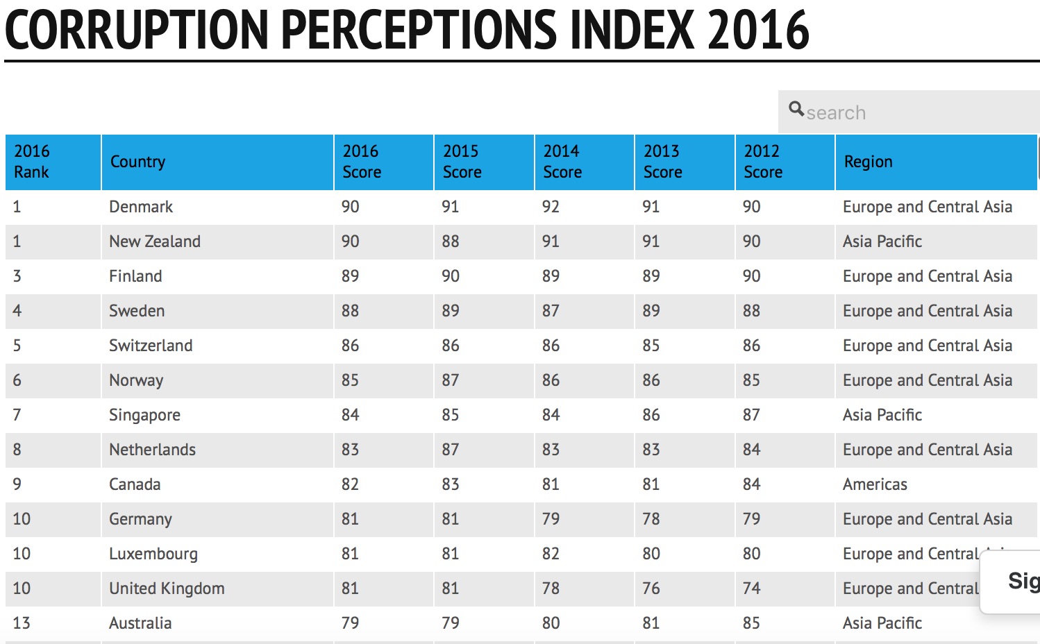 وأحرزت 69% من 176 دولة مشمولة بمؤشر مدركات الفساد لعام 2016، أقل من 50 نقطة على مقياس يبدأ من 0 (حيث معدلات الفساد عالية للغاية)، إلى 100 (حيث تخلو الدولة من الفساد).