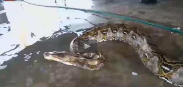 وعثر القرويون على الثعبان الذي يصل طوله إلى حوالي 16 قدماً ممداً في الوحل، وهو يحاول أن يهضم وجبة الطعام الدسمة التي التهمها. وخاف القرويون في البداية من الاقتراب من الثعبان بسبب حجمة الضخم ومظهره المرعب، وحاولوا أن يبعدوه باستخدام العصي، بحسب ما أوردت صحيفة ديلي ميل البريطانية.
