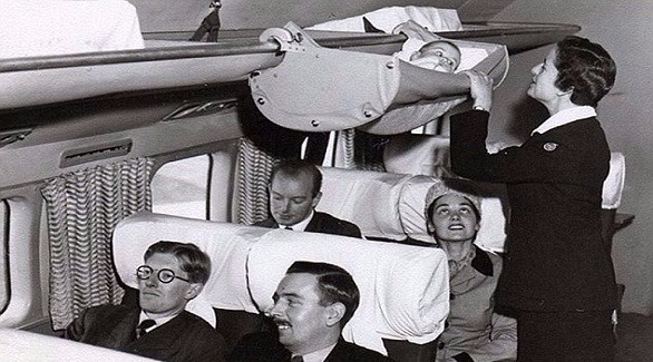 وفي الوقت الذي توفر شركات الطيران في الوقت الحالي مقاعد خاصة مزودة بأحزمة أمان للأطفال، كان الأمر مختلفاً في الماضي، حيث تظهر صور تعود إلى الخمسينات من القرن العشرين، كيف كان الطفل يوضع داخل مهد خاص فوق مقعد ذويه على متن الطائرة.