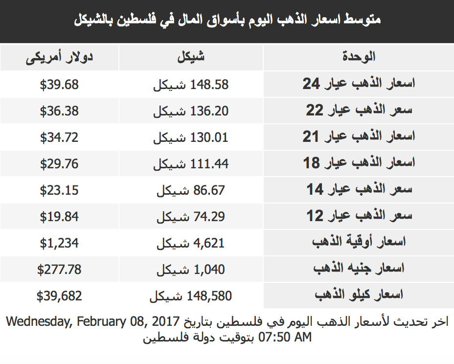 رام الله - الاقتصادي - جاءت أسعار جرام الذهب وفق كل عيار (24, 22, 21, 18, 14, 12)، في السوق الفلسطينية لليوم الأربعاء، على النحو التالي: