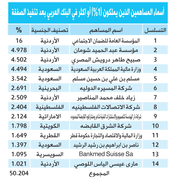 الصفقة رفعت حصة المساهم الأردني في البنك من 39% قبل تنفيذ الصفقة إلى 48.7% وهي نسبة تعد المرة الأولى منذ عقود يصلها هذا البنك.