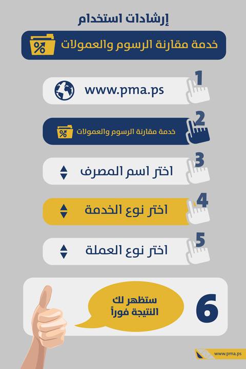 وأصبح بإمكان المواطنين، من خلال زيارة الموقع الالكتروني لسلطة النقد الفلسطينية، الاطلاع على نوع وقيمة الرسوم والعمولات المصرفية لتمكينهم من مقارنتها واختيار الأنسب منها، قبل زيارة فروع المصارف لاستكمال معاملاتهم المصرفية، من خلال الموقع الالكتروني لسلطة النقد www.pma.ps.