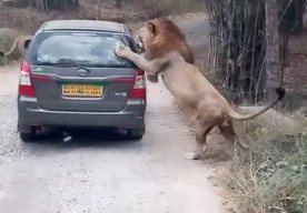 وكالات - الاقتصادي - وثق مجموعة من السياح خلال تواجدهم بمحية برية فى الهند، لحظة مهاجمة أسد برى لسيارة سفارى خلال تجولها بالمحمية.
