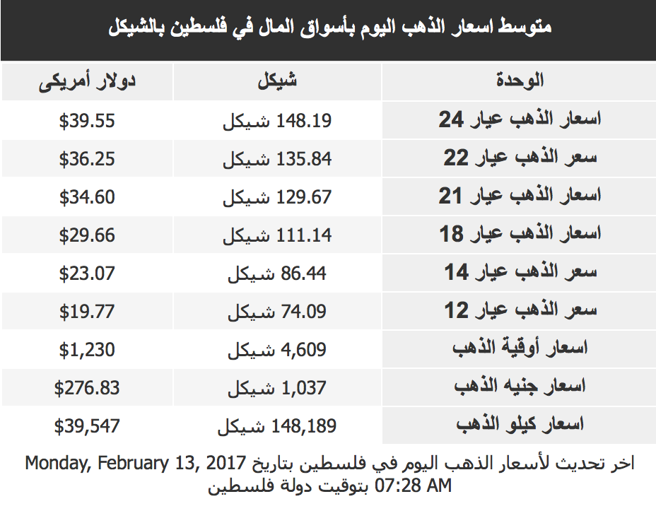 رام الله - الاقتصادي - جاءت أسعار جرام الذهب وفق كل عيار (24, 22, 21, 18, 14, 12)، في السوق الفلسطينية لليوم الإثنين، على النحو التالي: