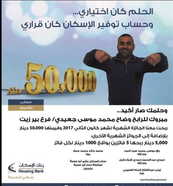 رام الله - الاقتصادي - أعلن بنك الإسكان فروع فلسطين عن نتائج السحب على الجائزة الشهرية لجوائز حسابات التوفير لشهر كانون الثاني 2017 الحالي والتي تبلغ قيمتها 50 ألف دينار، التي ربحها وضاح محمد موسى جعيدي وهو صاحب حساب توفير لدى البنك فرع بيرزيت، بالاضافة الى 5 رابحين بجوائز قيمة كل منها 1,000 دينار.