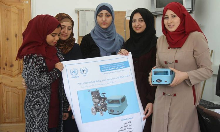 الفريق المكون من خمس طالبات من كلية غزة للتدريب التابعة لوكالة غوث وتشغيل اللاجئين الفلسطينيين "أونروا"، أطلقن على فكرة مشروعهم اسم "صوتي خطوتي"، والذي يهدف إلى توفير كرسي كهربائي متحرك يتم التحكم به من خلال بصمة الصوت واليد لتسهيل مهمة مستخدميه في التحكم به والتحرك بالاتجاهات بجميع المختلفة.