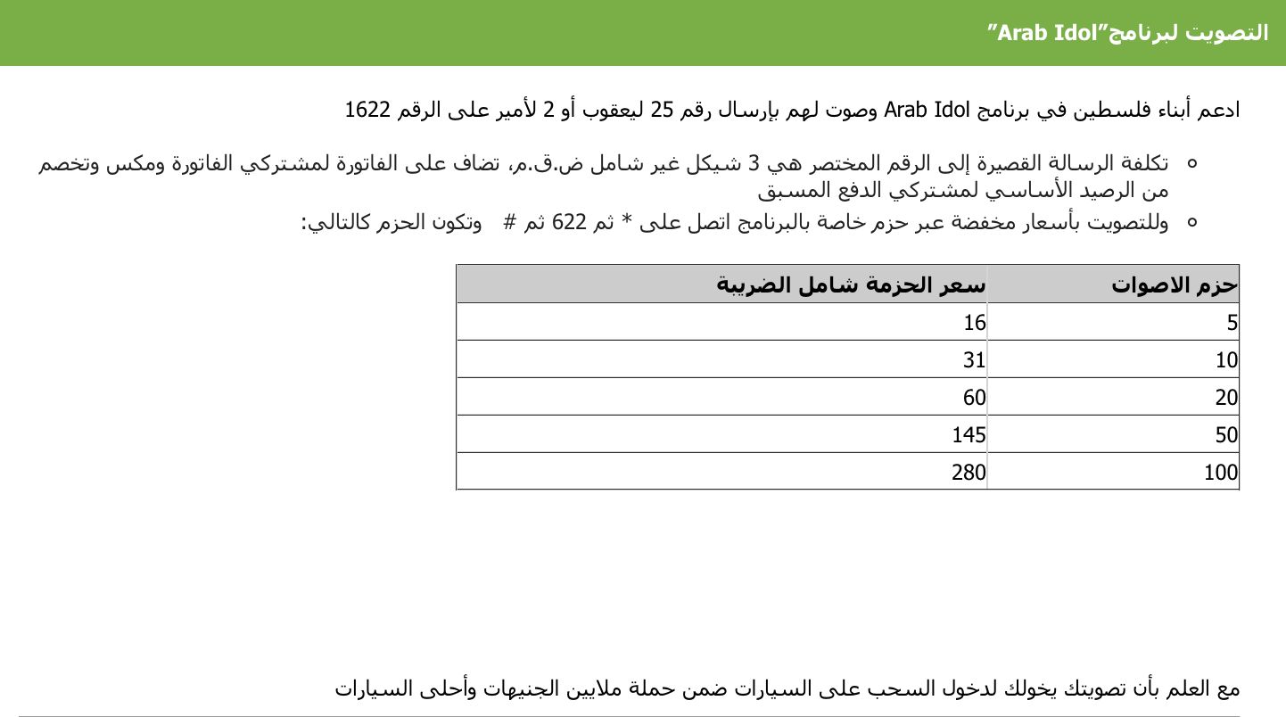 من جهتها أعلنت شركة الاتصالات الخليوية الفلسطينية (جوال) عن حزم تصويت في برنامج محبوب العرب في موسمه الرابع، يكون سعرها أقل من السعر الفردي للتصويت المنفرد.