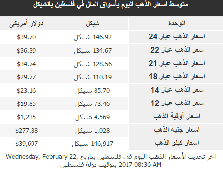 رام الله - الاقتصادي - جاءت أسعار جرام الذهب وفق كل عيار (24, 22, 21, 18, 14, 12)، في السوق الفلسطينية لليوم الاربعاء، على النحو التالي: -