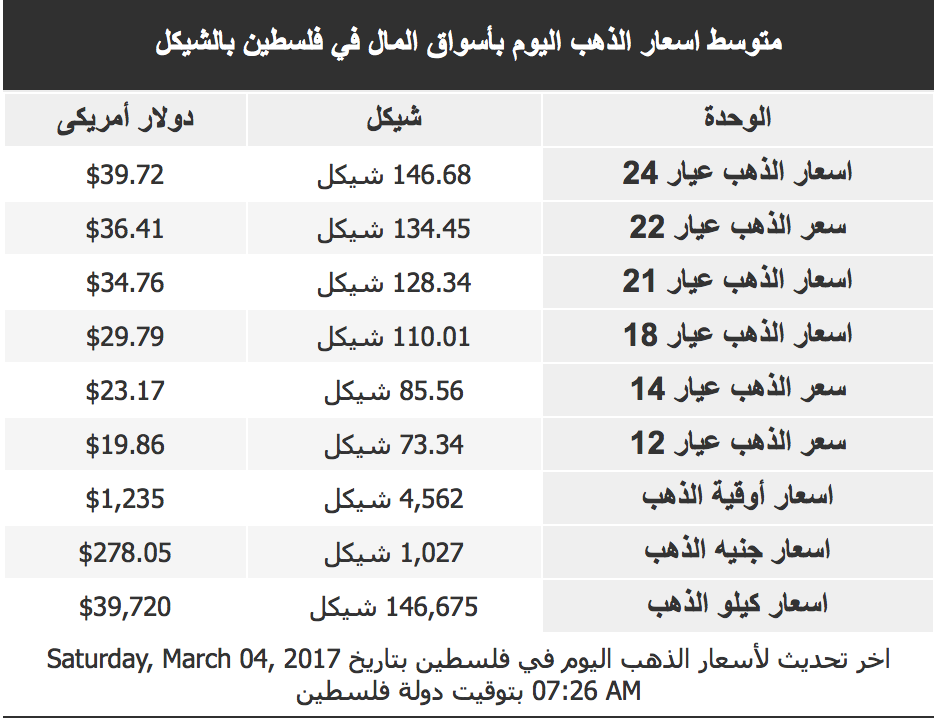 وكالات - الاقتصادي - جاءت أسعار جرام الذهب وفق كل عيار (24, 22, 21, 18, 14, 12)، في السوق الفلسطينية لليوم السبت، على النحو التالي: