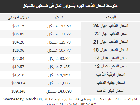 رام الله - الاقتصادي - جاءت أسعار جرام الذهب وفق كل عيار (24, 22, 21, 18, 14, 12)، في السوق الفلسطينية لليوم الاربعاء، على النحو التالي: