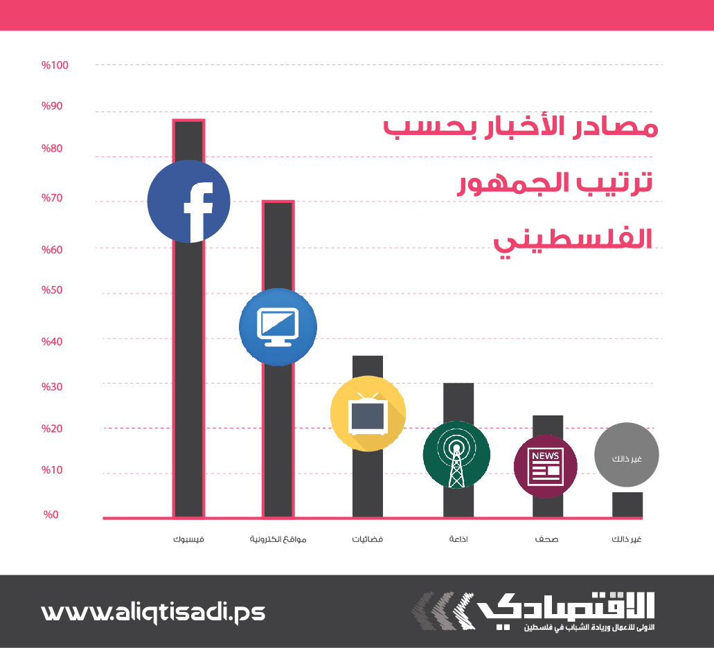 ويستدل من الدراسة أن نحو 90% من الجمهور الفلسطيني يعتمد على الفيسبوك كمصدر للأخبار، ونحو 70% يعتمدون على المواقع الالكترونية الاخبارية وغيرها، في حين أن نحو 35% فقط من الجمهور يعتمد على الفضائيات كمصدر للأخبار، و30% يعتمدون على الإذاعات ونحو 20% فقط من الجمهور يعتمد على الصحف .