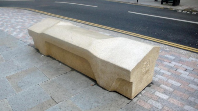 هذا المقعد في لندن لديه سطح مُضلع، لكي يمنع الناس من النوم عليه. بالإضافة إلى أنه لا يوجد به أي تجاويف لكي لا يتم رمي أي نفايات أسفله.