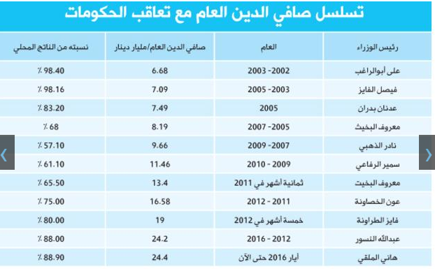 ليأتي بعد ذلك عبدالله النسور ويستلم منصب رئاسة الحكومة لمدة 4 سنوات ليقفز الدين العام في نهايتها إلى نحو 24 مليار دينار ونسبته من الناتج المحلي 88 %.
