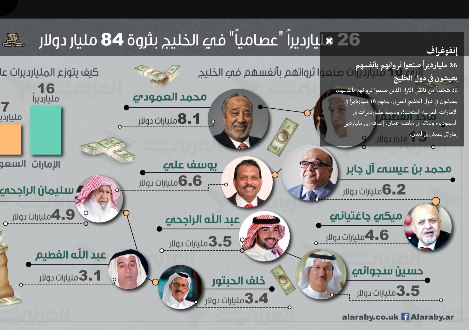 لندن - الاقتصادي - (العربي الجديد) - 26 شخصاً من الأغنياء الذين صنعوا ثرواتهم بأنفسهم يعيشون في دول الخليج العربي، بينهم 16 مليارديراً في الإمارات العربية المتحدة، وسبعة مليارديرات في السعودية، وثلاثة في سلطنة عمان. إضافة إلى ملياردير إماراتي يعيش في لندن.