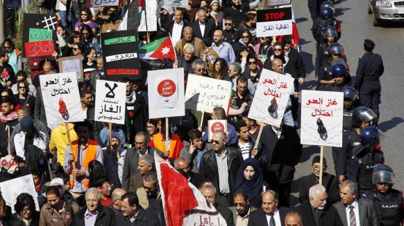 وهتف المشاركون في المسيرة التي جاءت بعد أيام من إحياء المملكة ذكرى معركة الكرامة، مجددين رفضهم لاستيراد الغاز المسروق من الأرض الفلسطينية.