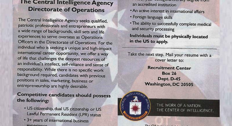 وكالات - الاقتصادي - نشرت وكالة الاستخبارات الأميركية (سي آي إيه) إعلان توظيف في مجلة إيكونوميست، في القسم الخاص بإعلانات الوظائف الكبرى تطلب "ضباط عمليات" من المهنيين ورجال الأعمال.